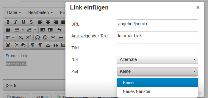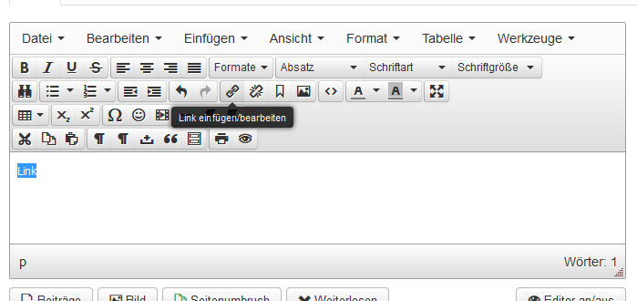 Um einen Text oder ein Bild zu verlinken, markieren Sie es und klicken Sie auf das Symbol: Link einfügen / bearbeiten.