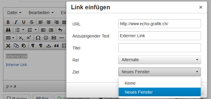 Geben Sie bei URL eine externe Webadresse ein und wählen Sie bei Ziel: Neues Fenster.