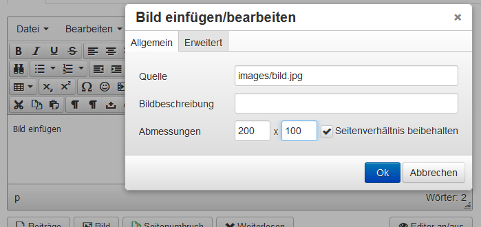 Klicken Sie auf das Icon: Bild einfügen / bearbeiten. Geben Sie die Quelle und Abmessung an. Wenn Sie die Felder für Abmessung leer lassen, wird automatisch die Originalgrösse übernommen.