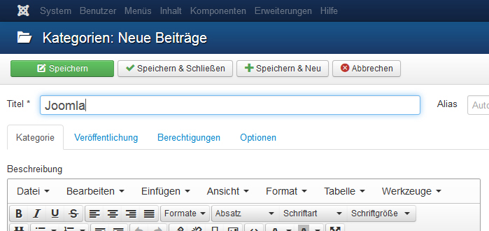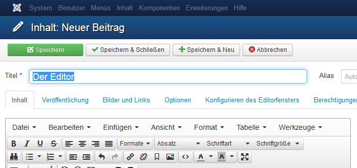 Geben Sie dem Beitrag einen Titel. Das Alias wird automatisch erstellt. Klicken Sie auf Speichern, um im Beitrag zu bleiben. Klicken Sie auf Speichern und Schliessen oder Abbrechen, um den Beitrag zu verlassen.