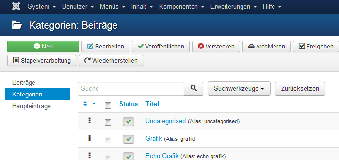 Sie haben im Menü Inhalt oder links in der Navigation > Kategorien gewählt. Um eine neue Kategorie zu erstellen, klicken Sie auf den grünen Button: Neu.