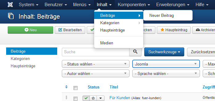 Sie haben im Menü Inhalt > Beiträge gewählt. Um einen neuen Beitrag zu erstellen, klicken Sie auf den grünen Button: Neu. Um einen bestehenden Beitrag zu bearbeiten, klicken Sie auf den Titel des Beitrags.