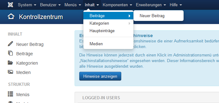Das Kontrollzentrum ist die Einstiegsseite von Joomla. Wählen Sie in der Menüleiste aus, was Sie tun möchten: